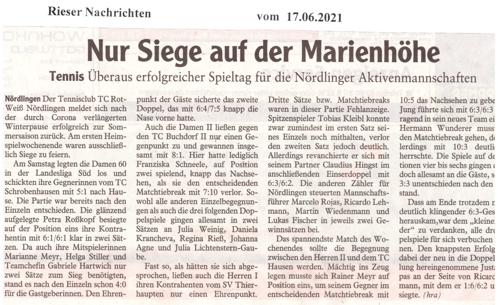 TCN-Berichte 2021RN vom 28.09.2021 - Nachwuchs in allen Altersklassen - Mitgliederversammlung ____________________________________________________ RN vom 23.09.2021 - TCN ein großzügiger Gastgeber - Bei der Jugendkreismeisterschaft nehmen die Gäste alle sieben Titel mit ____________________________________________________ RN vom 03.08.2021 - Junioren des TC Nördlingen feiern die Meisterschaft - TCN Niederlage gegen den Lokalrivalen Deinigen _______________________________________________________________________________ _______________________________________________________________________________ _____________________________________________________ RN vom 22.07.2021 - Mixed Tunier und Sommerfest auf der Marienhöhe _____________________________________________________ _____________________________________________________ _____________________________________________________ _____________________________________________________ _____________________________________________________ RN vom 09.07.2021 - Vierter Sieg der Junioren - TCN-Nachwuchs erneut erfolgreich _____________________________________________________ _____________________________________________________ ____________________________________________________________________________________ ____________________________________________________________________________________ _____________________________________________________ RN vom 23.06.2021 - Die Kleinsten spielen groß - Nördlinger gewinnen ihr Match klar ___________________________________________________ RN vom 23.06.2021 - Nördlinger Damen siegen - Zweiter Spieltag verläuft positiv ____________________________________________________________________________________ ____________________________________________________________________________________ |